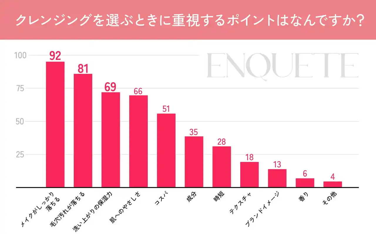 当社が実施したアンケート調査(n=109)では、クレンジング選びで重視するポイントとして次の結果が明らかになりました。 |
