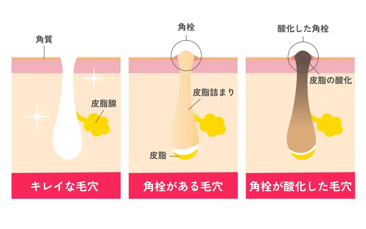 皮脂は時間が経つにつれて酸化し、そこにメイク汚れや古い角質が絡み合うことで、角栓へと変化し、黒ずみや詰まりにつながっていきます。 |