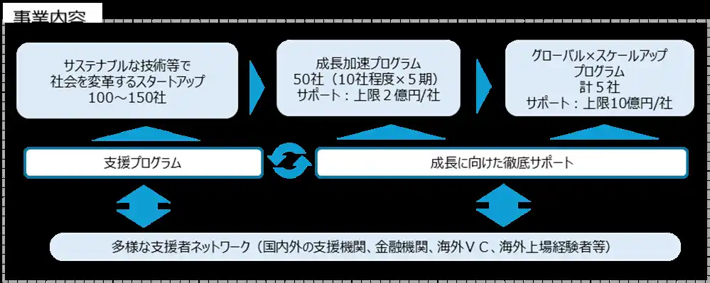 さらに、SusHi Tech Global Startupsの中から、グローバルな成長につながる取組を募り、「成長加速プログラム」として1件当たり上限2億円の資金サポートとオーダーメイド型の伴走支援を実施します。 |