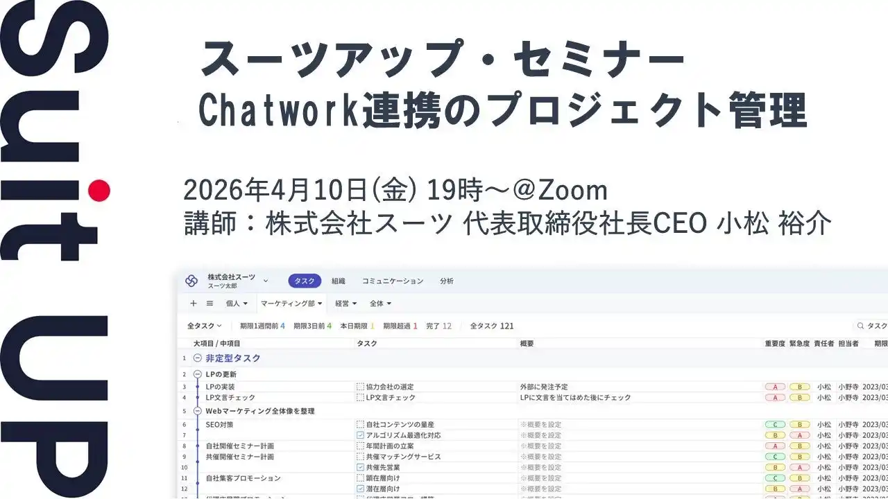 株式会社スーツ(所在地:東京都千代田区、代表取締役社長CEO:小松 裕介)は、2026年4月10日(金)19時から、当社代表の小松が講師を務めるスーツアップ・セミナー「Chatwork連携のプロジェクト管理」を無料開催します。
