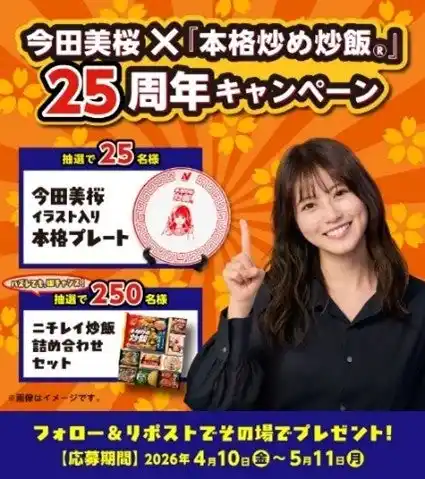 25周年を記念して今田美桜さんイラスト入り本格プレートを25名様、Wチャンスでニチレイ炒飯詰め合わせを250名様へプレゼントするキャンペーンを実施 |