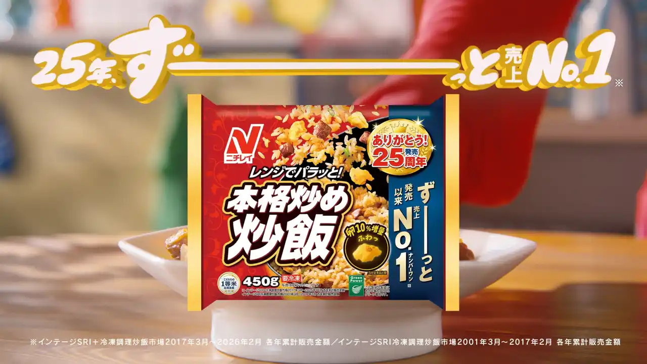 今田さん「この度、ニチレイフーズ『本格炒め炒飯(R)』の新CMシリーズが始まります。2001年に初登場以来、25年ずっと売上No.1です。炒飯はニチレイ!『本格炒め炒飯(R)』を、皆さんもぜひお楽しみください!」 |