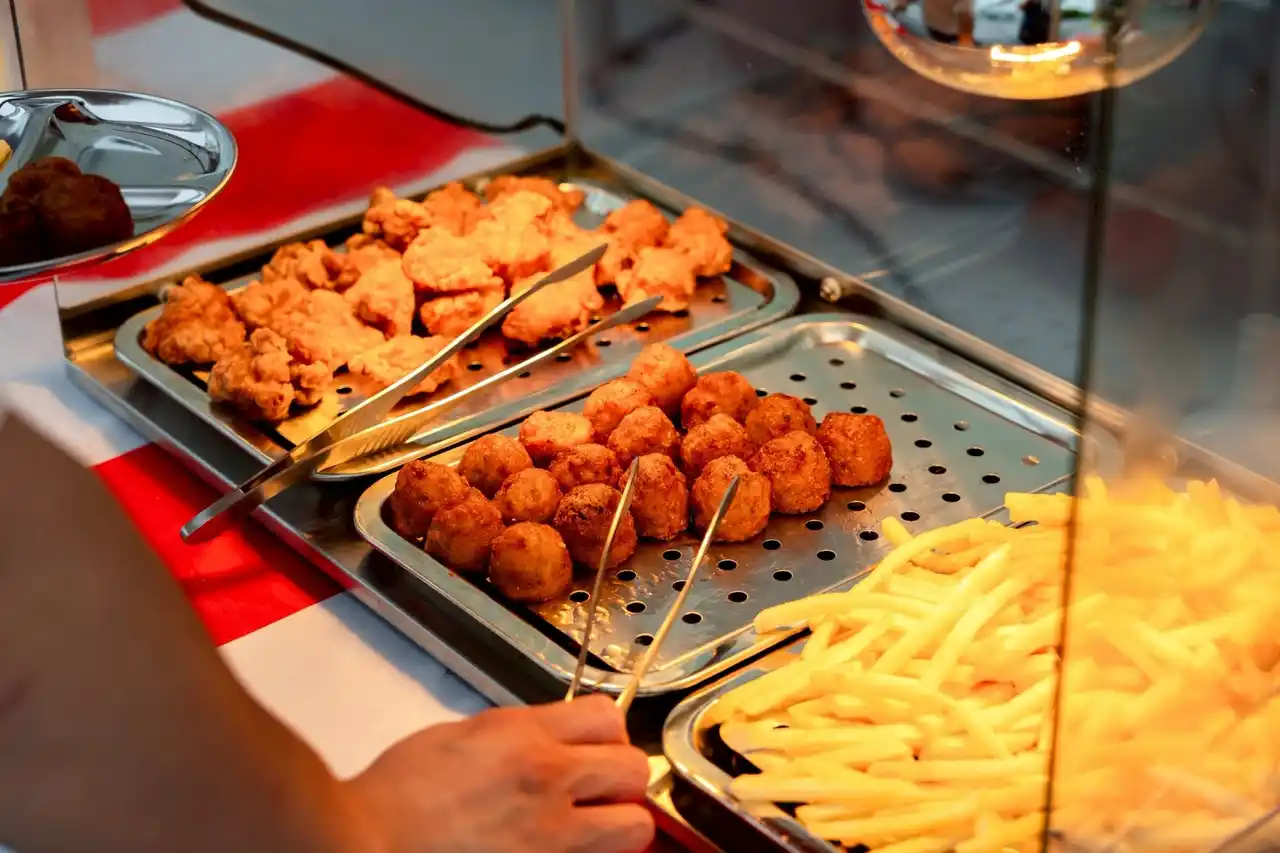 焼きたての肉がジュウと音を立て、 たこ焼きやからあげの香りがふわっと広がる。 |