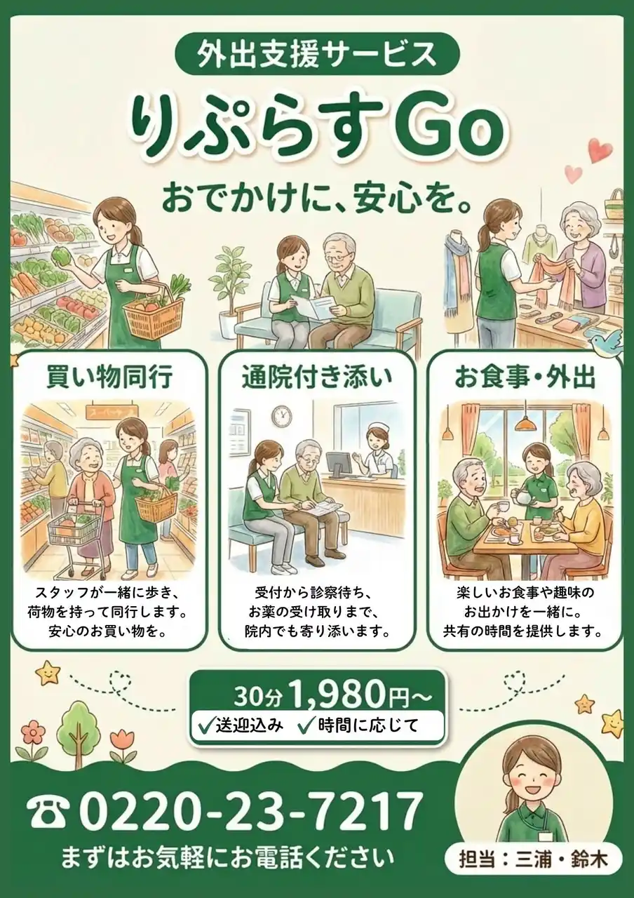 | 一般社団法人りぷらす(代表理事:橋本大吾、宮城県石巻市)は、2026年4月15日よりスタジオぷらす登米において「外出支援サービス」を開始します。買い物同行、医療機関への同行支援、趣味のお出かけ、送迎を通じて、介護保険では対応できない生活場面をサポート。社会との接点を再構築し、「自分らしい暮らし」を実現します。 | |||