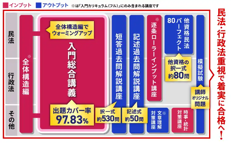 本カリキュラムの核となる「入門総合講義」のテキストは、試験問題の出題カバー率が驚異の97.83%!このテキストは、法律の土台となる大きな「幹」をまず制作し、そこへ毎年最新の法改正や最新判例を反映させることで、常にブラッシュアップを続けています。 合格に必要な情報はすべて講義とテキストの中に集約されているため、 法律に不慣れな方や学習にブランクのある方でも、あれこれと他の教材に手を広げる必要はありません。「基礎から最新情報まで、合格に必要なすべてを網羅」したこのテキストが、あなたの最短合格を強力にバックアップします。 |