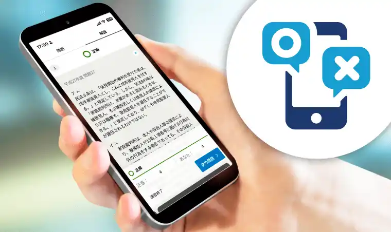 「オンライン演習サービスTOKERUKUN」では、お手持ちのスマートフォンで択一式試験の過去問を繰り返し解くことができます。 場所を選ばずに学習できるので、移動中などの隙間時間で択一式の解答力を磨くことができます。 |