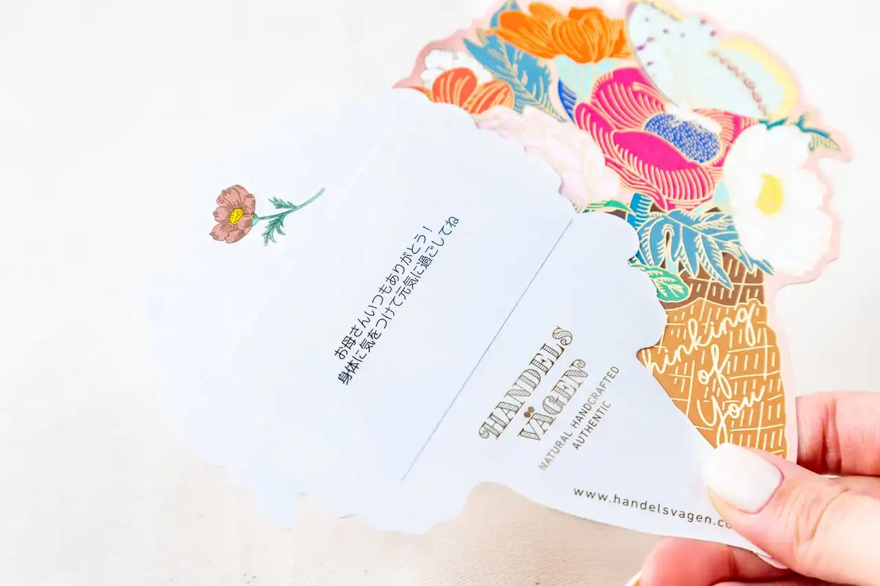 カードのデザインは、ハンデルスベーゲンの公式サイトやシーズナルキャンペーンのアートディレクションを担当する増子勇作さんによるもの。「Thinking of you」の文字が入ったアイスクリームコーンに、カーネーションをはじめ、様々な花があしらわれています。花束の形に切り抜かれたダイカット仕様に金の箔押しも施され、華やかさもプラスされた素敵な仕上がりになりました。 |