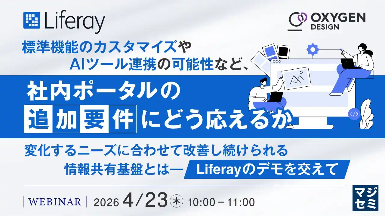 ■業務効率を支える社内ポータルの重要性 多くの社員を抱える大企業にとって、社内ポータルは単なる情報共有の場ではなく、社員が必要な情報や業務アプリに迷わずたどり着き、日々の業務を円滑に進めるための重要な基盤となっています。拠点や部門、役割ごとに扱う情報や業務プロセスが異なり、働き方や利用環境も多様化する中で、社内ポータルには情報を集約するだけでなく、それぞれの現場にとって使いやすく、業務効率の向上に貢献する役割が求められています。 ■標準機能中心の社内ポータルでは追加要件に応えにくい 一方で、既存の社内ポータルは導入当初の要件には対応できていても、運用を続ける中で生まれる新たな追加要件に十分応えきれなくなることがあります。 たとえば、部門ごとの業務に合わせて標準機能をカスタマイズしたい、利用者の使いやすさに合わせて導線を見直したい、AIツール連携も視野に入れて情報活用の幅を広げたいといった要望が出てきても、多くの製品では標準機能を前提とした運用が中心となるため、自社の要件に合わせて柔軟に対応することが難しくなりがちです。その結果、必要な改善が進まず、現場にとって使いやすい環境を維持しにくくなるだけでなく、社内ポータルが本来持つ業務効率化や情報活用のポテンシャルを十分に発揮できなくなります。 ■変化するニーズに合わせて改善し続けられる基盤へ 本セミナーでは、社内ポータルに次々と求められる追加要件に応えながら、現場にとって使いやすい環境を継続的に実現していくために、なぜ拡張性やカスタマイズ性に優れた基盤が求められるのかを整理します。その上で、「Liferay DXP」により、標準機能のカスタマイズやAIツール連携のニーズへの対応可能性(カスタマイズによる拡張を含む)、また変化する要件に合わせて改善し続けられる情報共有基盤をどのように実現できるのかを解説します。セミナー内では、デモを通じて実際の操作や構築方法、拡張性の考え方もご紹介し、拡張の方向性や活用イメージをお伝えします。 事業環境の変化に合わせて改善し続けられる社内ポータルを構築し、業務効率の向上や継続的な活用につなげたい方におすすめのセミナーです。 ■主催・共催 株式会社オキシゲンデザイン ■協力 株式会社オープンソース活用研究所 マジセミ株式会社 |