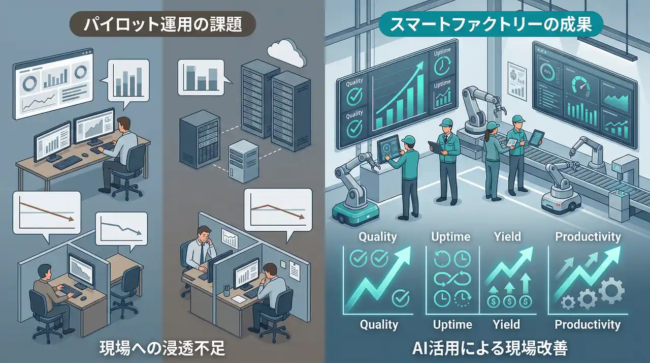 製造業では生成AI(GenAI)の検証が広がる一方、拠点横断のスケールや現場定着が難しく、「パイロット(PoC)は動くが、工場のKPIは改善しない」という課題が顕在化しています。Deloitteの調査整理でも、生成AIのパイロット着手は高水準である一方、工場・ネットワーク全体へ展開できている割合は限定的です。 |