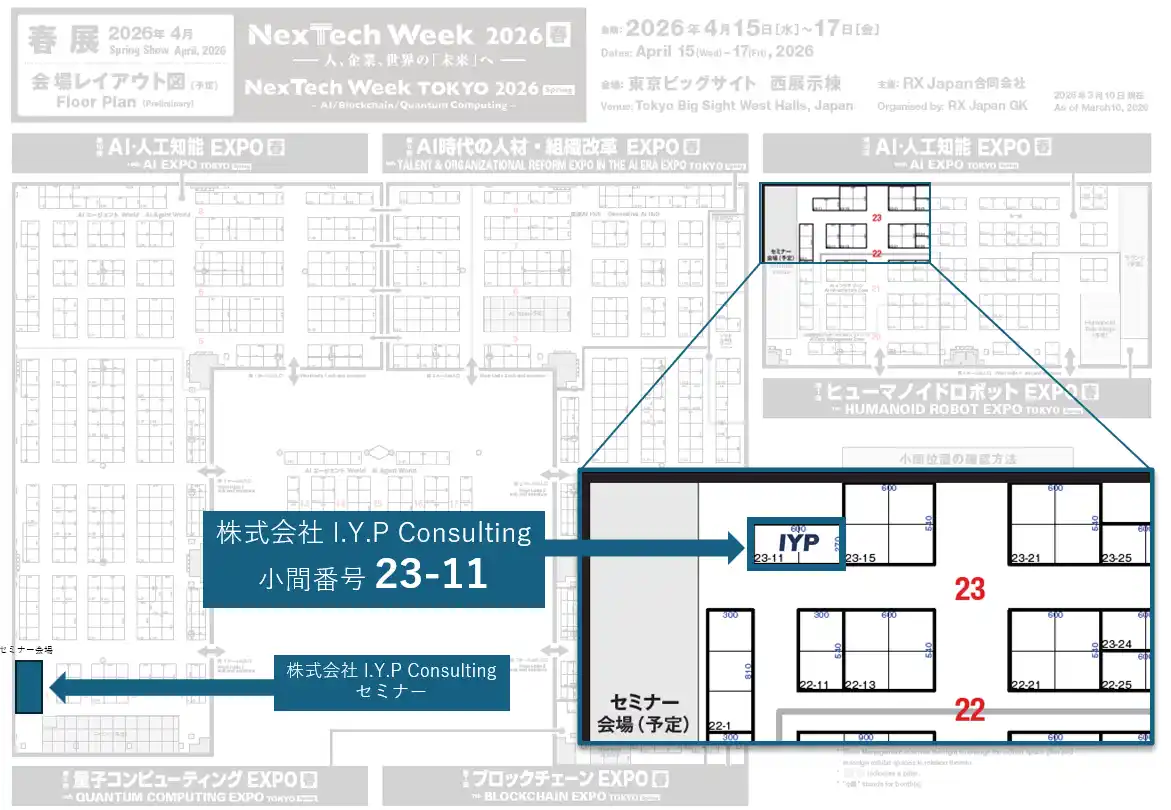 株式会社I.Y.P Consulting(本社:東京都中央区、代表者:崔 晉豪、以下IYP)は、2026年4月15日(水)~17日(金)に東京ビッグサイト(西展示棟)で開催される「NexTech Week 2026」に出展します。本出展では、生成AI導入済みでも工場・製造現場で成果が出ない企業に向け、リテラシー整備/To-Be設計/業務整理/導入アセスメント/現場実装・定着までを一気通貫で支援する「AI業務改革コンサルティング」をご紹介します(※本出展でご案内するのは、特定プロダクト販売ではなく、課題起点でのコンサルティングサービスです)。 |