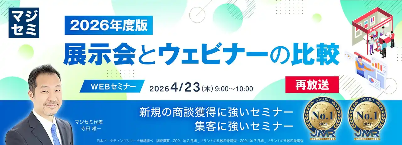 | マジセミ株式会社は「【再放送】2026年版 展示会とウェビナーの比較」というテーマのウェビナーを開催します。 |