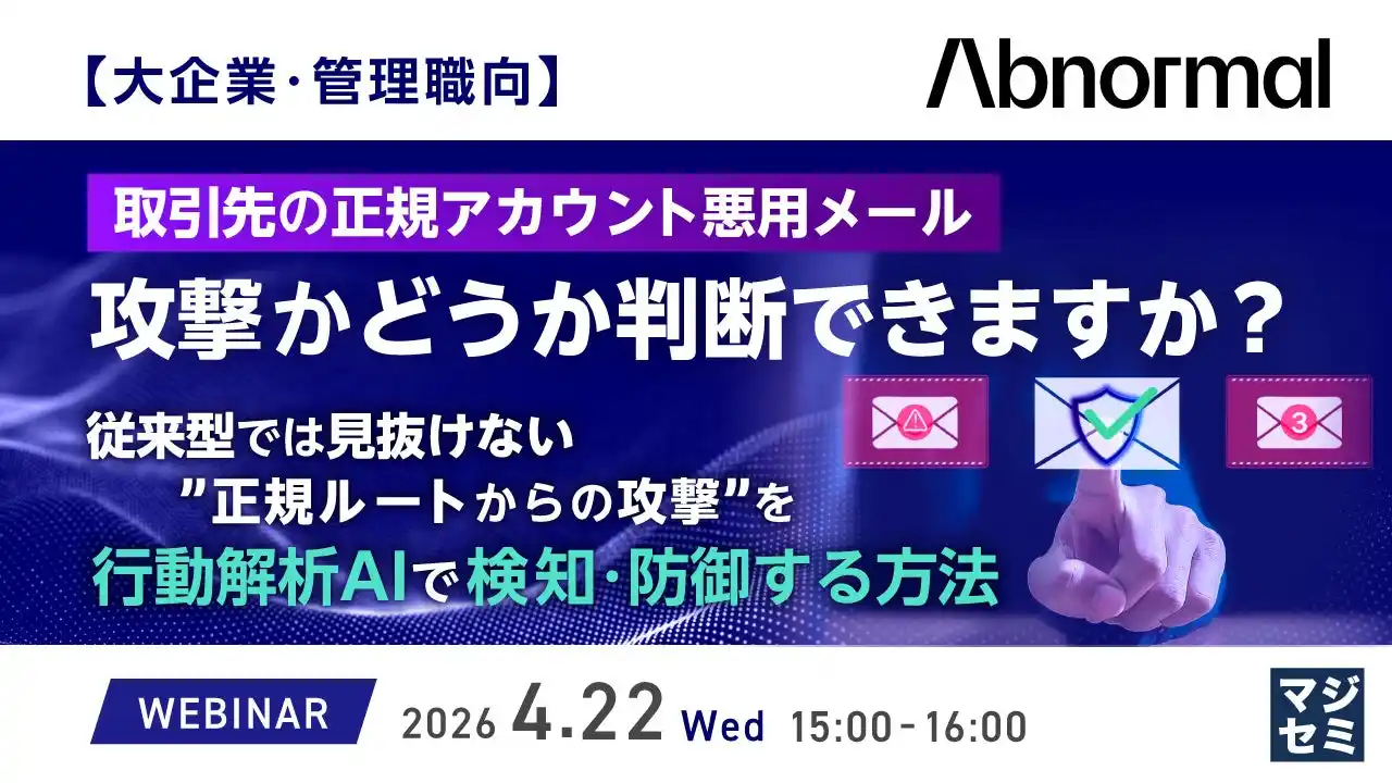 ■行動ベースAI検知で未知の脅威を捕捉、運用自動化や従業員教育まで実現する方法 本セミナーでは、メールの内容や送信元ドメインだけでなく、「誰が・誰に・どのようなやり取りをしてきたか」という行動パターンを学習するAIにより、正規アカウントや正規ドメインを悪用した高度ななりすましを検知するアプローチを解説します。 グローバルかつ大規模なメール環境で蓄積された行動データをもとに、未知の脅威を高精度に捕捉しつつ、アラートの自動分類やワークフロー連携で運用負荷を下げる方法、さらに従業員教育やフィッシング報告の自動化まで含めた、実践的な対策の進め方を具体的なシナリオを交えてご紹介します。 ■主催・共催 Abnormal AI Inc. ■協力 株式会社オープンソース活用研究所 マジセミ株式会社 |