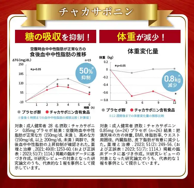 チャカサポニンには食事に含まれる脂肪の吸収を抑えて、食後の血中中性脂肪の上昇を抑える機能があることが報告されています。また肥満気味な方の体脂肪、お腹の脂肪(内臓脂肪、皮下脂肪)、ウエスト周囲径、体重の減少をサポートすることで、高めのBMIを改善させる機能が報告されています。 |