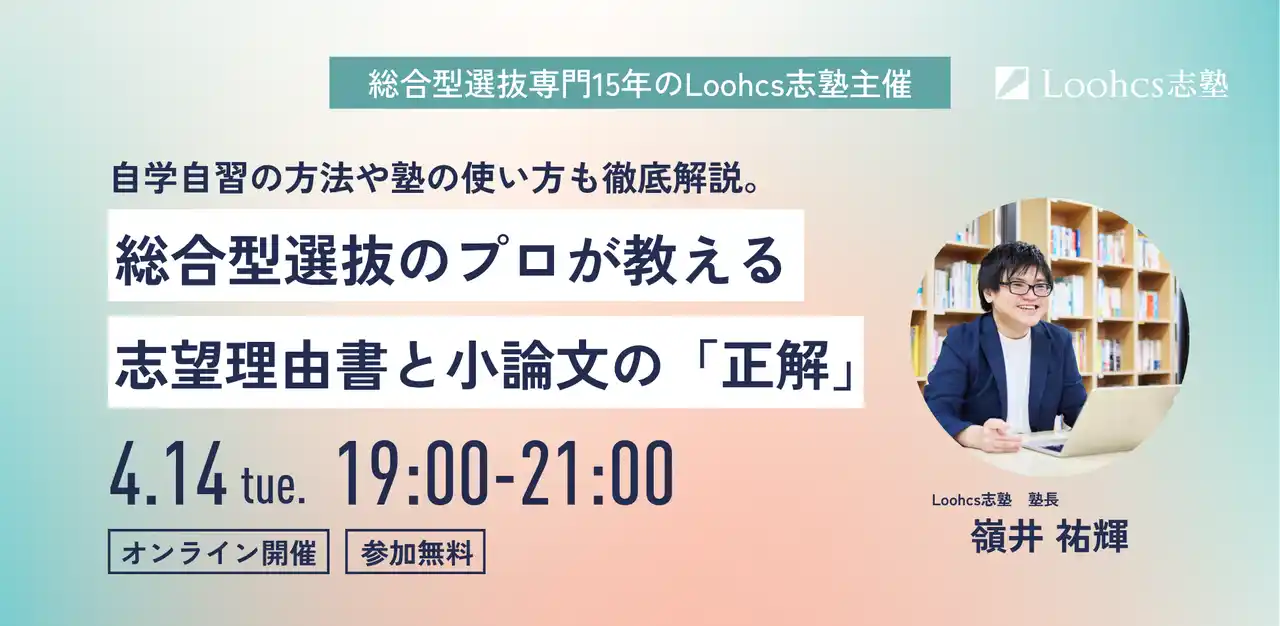 本セミナーでは、総合型選抜指導のプロであるルークス志塾代表・嶺井が登壇し、志望理由書の書き方の基礎から大学・学部別対策、小論文の自学自習の進め方、さらには塾の効果的な活用方法まで、実際の指導内容に基づいて具体的に解説します。 |