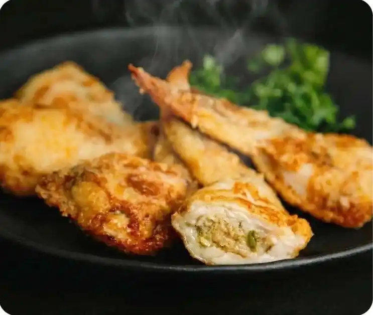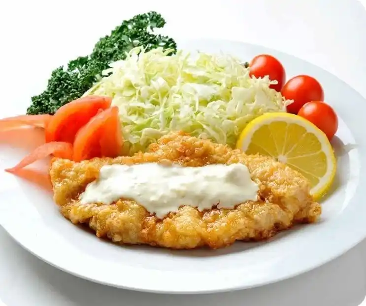 ヘルシーな鶏ムネ肉にこだわったおいしさ。ムネ肉を包む衣に、秘伝の南蛮ダレを染み込ませ、ひと口で甘酸っぱい味が口の中に広がります。玉ねぎの食感と風味を生かしたタルタルソースをたっぷりとつけて。 |