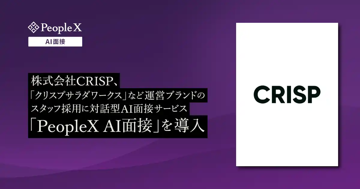 採用から活躍支援まで、AIで人事課題を解決する株式会社PeopleX(本社:東京都新宿区、代表取締役CEO:橘 大地、以下:当社)は、株式会社CRISP(本社:東京都港区、代表取締役CEO:宮野 浩史)に、当社が提供する対話型AI面接サービス「PeopleX AI面接」が導入されたことをお知らせいたします。今後、同社が展開する「クリスプサラダワークス」および「トーキョーアジフライ」のスタッフ採用において、本サービスを活用します。 |
