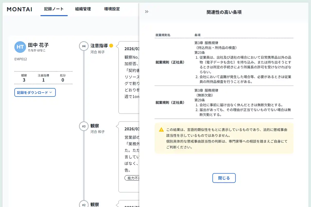 | 入力された観察記録の内容に応じて、あらかじめ登録されたユーザーの就業規則から関連性の高い条項をAIが自動で抽出する「AI規程参照」機能、および観察記録をもとに事象の種類や性質を整理する「AIカテゴリ分類」機能を搭載。担当者は観察記録と社内規程を照らし合わせながらルールに基づく注意指導の根拠を把握でき、より適切なマネジメントにつなげることができます。 | |||