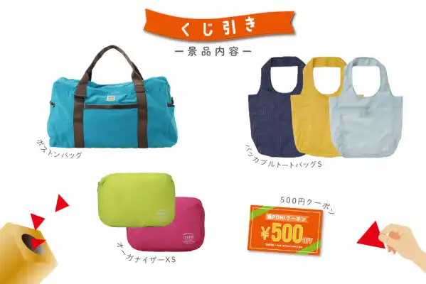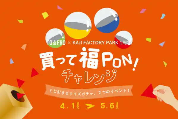 KAJI FACTORY PARKの1周年を記念し、TO&FROの直営3店舗(HANEDA店、TOKYO店、KAJI FACTORY PARK店)では、TO&FROで人気のボストンバッグやパッカブルトートバッグ、オーガナイザーXSなどが当たるおたのしみ企画として、2026年の5月6日までの期間中『買って福PON!チャレンジ』を開催しています。