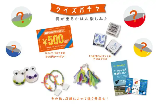 同時に『クイズに答えてガチャに挑戦!』という、直営店にお立ち寄りいただくだけでもお楽しみいただける企画も開催しておりますので、この機会にぜひTO&FRO直営店にお立ち寄りください。
