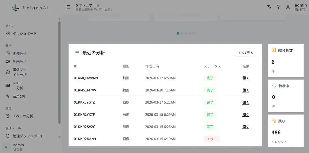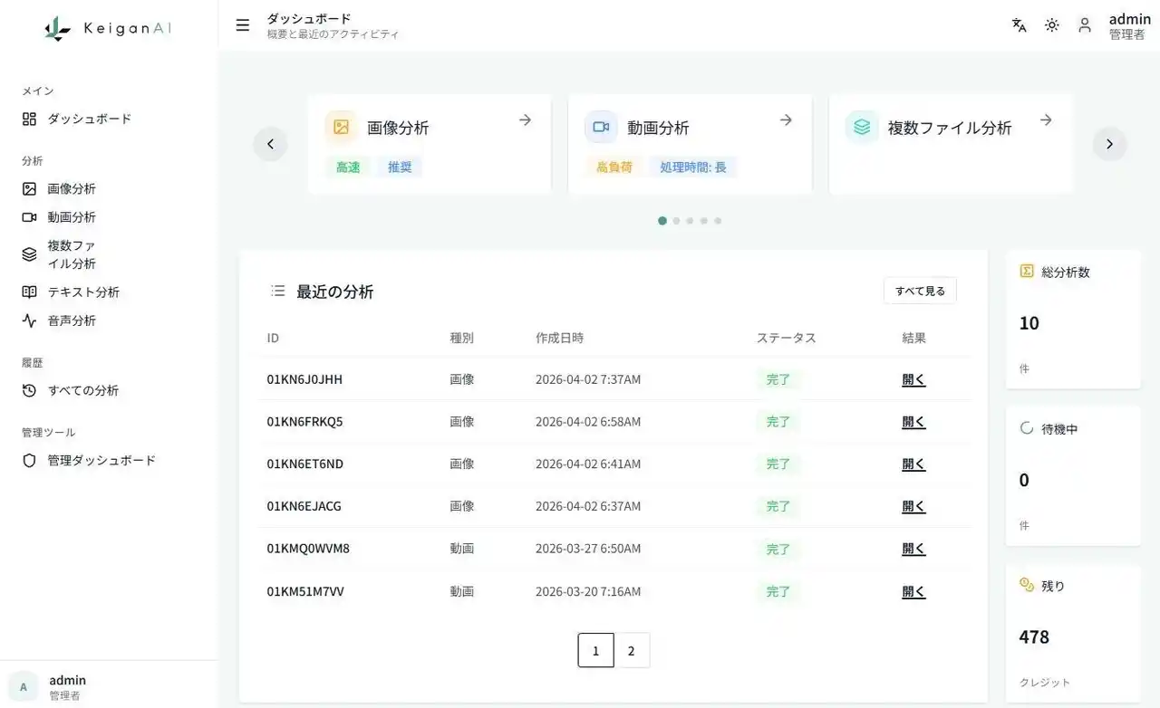 本バージョンでは、組織内での実運用を前提とした「解析ダッシュボード」「ジョブ管理」「クレジット管理」などの管理機能を中心としたUIを全面刷新しました。さらに、アーキテクチャの見直しによるスケーラビリティの向上やレポート印刷機能の追加により、組織での実運用における情報信頼性判断の迅速化と業務効率の向上を実現しました。 |