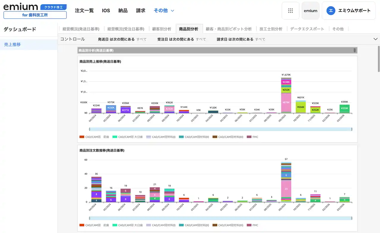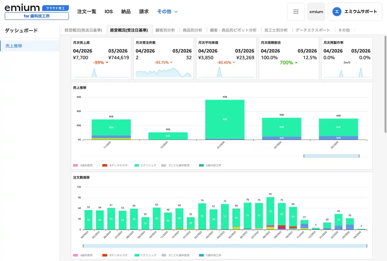 エミウム株式会社(本社:東京都新宿区、代表取締役:稲田雅彦、以下「当社」)は、歯科技工基幹業務クラウド「エミウム クラウド技工」の経営ダッシュボード機能を大幅にアップデートしたことをお知らせいたします。 |