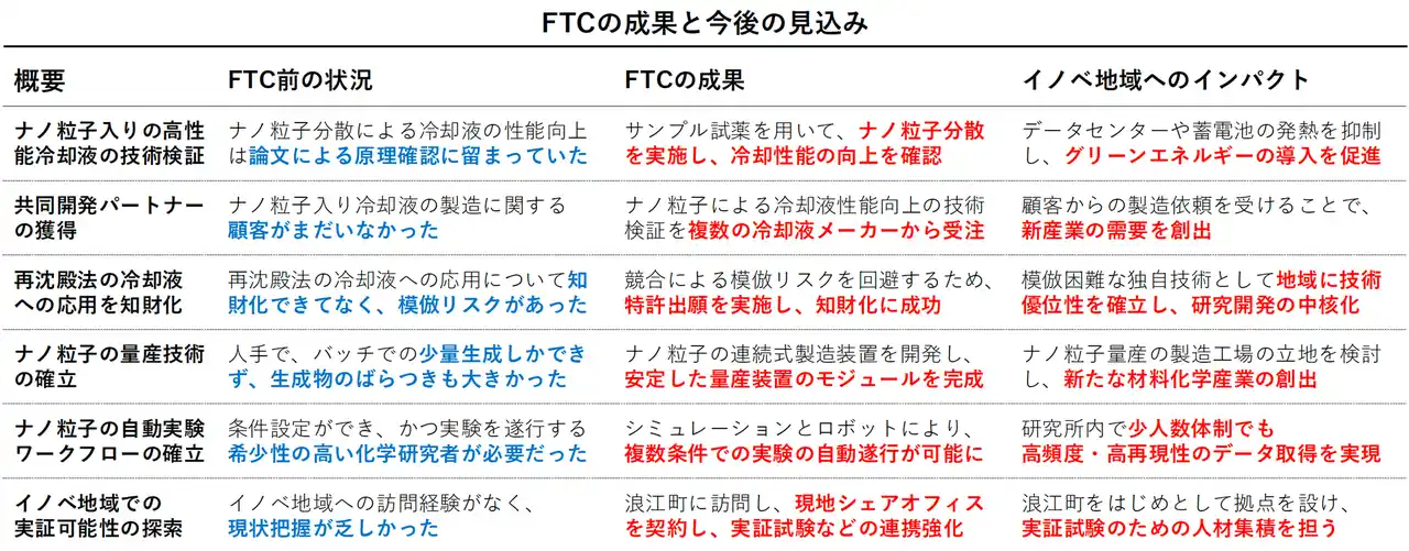 NanoFrontierは、令和7年度のFTCアクセラレーションプログラムにおいて「高効率なAIデータセンター液浸冷却液開発事業」をテーマに採択され、福島イノベーション・コースト構想の重点分野であるエネルギー・環境・リサイクル領域での事業化を推進してきました。1年目では、当初の計画通りすべての項目を履行し、ナノ粒子技術を"実験検証段階"から"量産・事業・地域実装"へと進化させることができました。 |