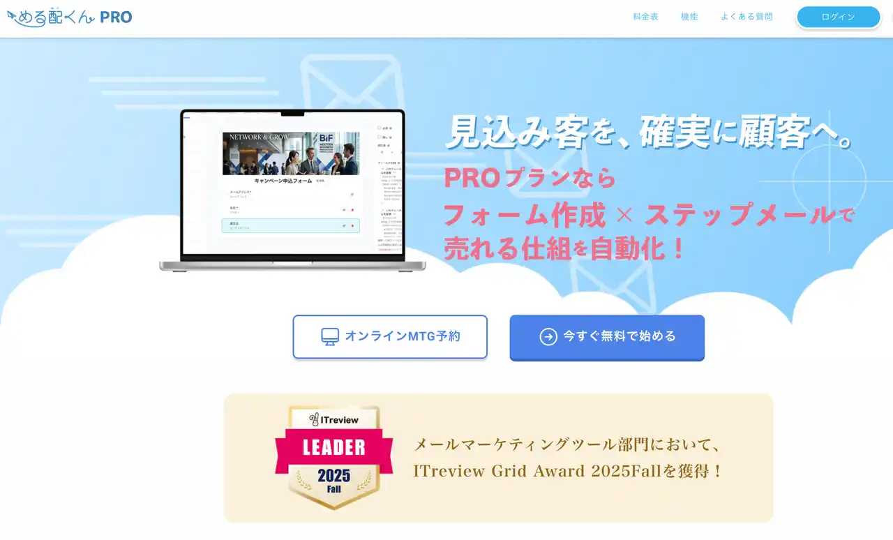 | 2002年よりメール配信SaaSの先駆けとしてサービスを提供している「める配くん」(運営:株式会社ディライトフル、本社:東京都江東区)は、2026年4月、既存顧客への配信に加え、見込み顧客の獲得・育成(リードナーチャリング)に特化した新ラインナップ**『プロプラン』**をリリースいたしました。 | |||