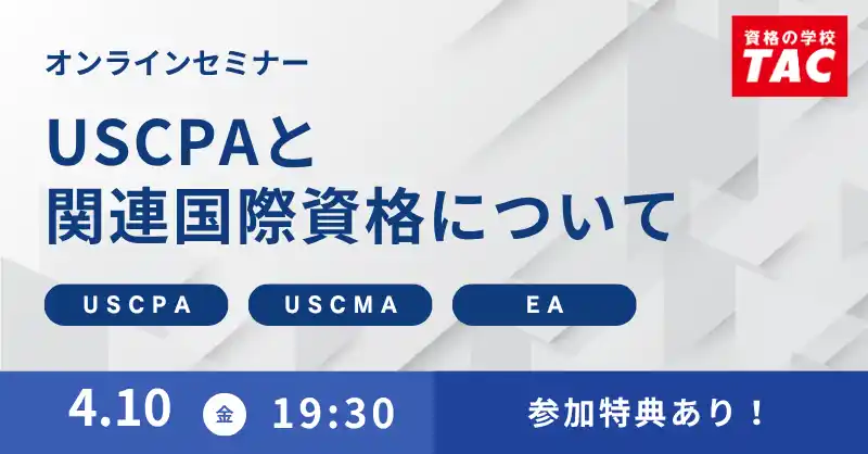 当セミナーではステップアップや転職の武器にもなるUSCPAなど魅力や受験手続き、そして、TACのコンテンツと共にご紹介いたします。これから初めてUSCPAを目指す方、英語や会計力を身に付けるために必要な資格を検討中の方におすすめのセミナーです。 |