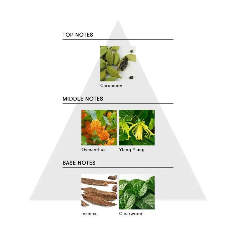 炭を思わせる静かなスモークが、カルダモンのほのかなスパイスとともに立ち上がる。やがて金木犀とイランイランのやわらかな甘さが広がり、インセンスの熱とクリアウッドの透明な余韻が重なっていく。灯りが落ちたあとの静けさに溶ける炭のように、気持ちを鎮め、自分の芯へとそっと還っていく香り。 |