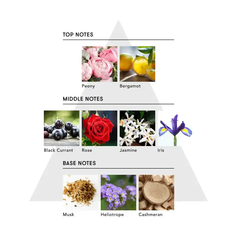 Middle:Black Currant,Rose,Jasmine,Iris |