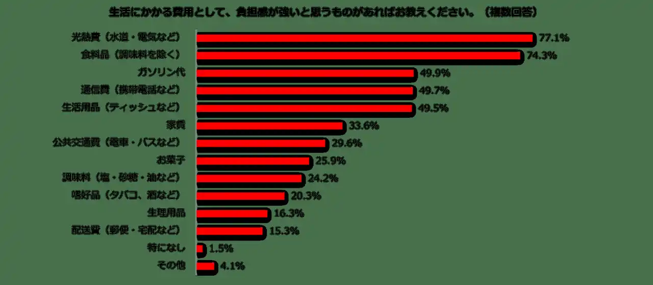 続けて「生活にかかる費用として、負担感が強いと思うものがあればお教えください」との質問に対しては、「光熱費(水道・電気など)」との回答が最も多く77.1%。次いで多かったのは「食料品(調味料を除く)」で74.3%でした。3位には国家備蓄の放出対応が必要な状況となっている「ガソリン代」が入って49.9%、さらに「通信費(携帯電話など)」が49.7%、「生活用品(ティッシュなど)」が49.5%と続きました。