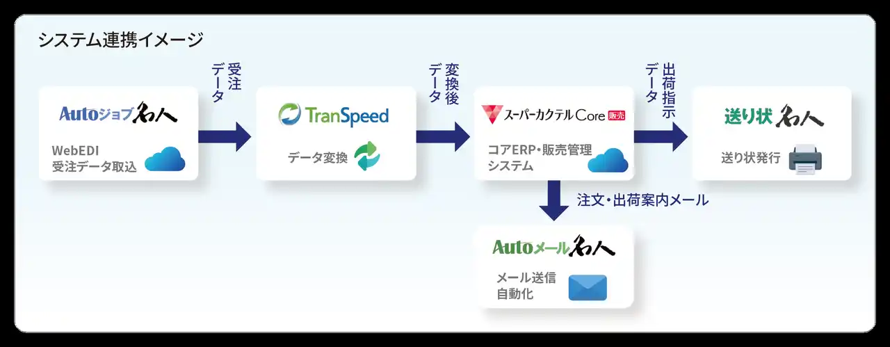 | まず、ワークショップやホームセンターの各種WebEDIから受ける注文データ処理を、「Autoジョブ名人」と「TranSpeed」で自動化。基幹システム「スーパーカクテルCore」と連携し、仕分けリストやピッキング予定データ、入荷予定データの作成を効率化したことで、出荷までのリードタイム削減につながっています。 | |||||||