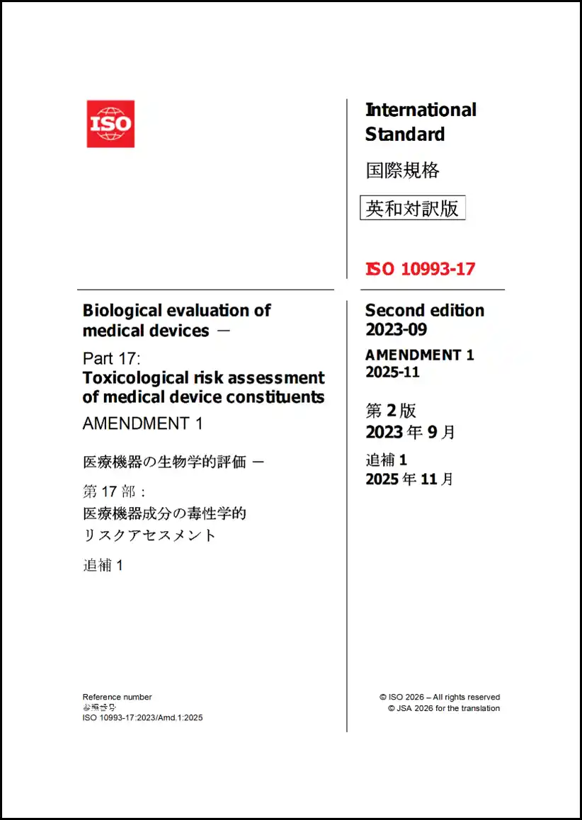 ISO 10993-17:2023/Amd 1:2025追補1-医療機器の生物学的評価-第17部:医療機器成分の毒性学的リスクアセスメント |