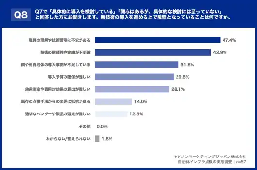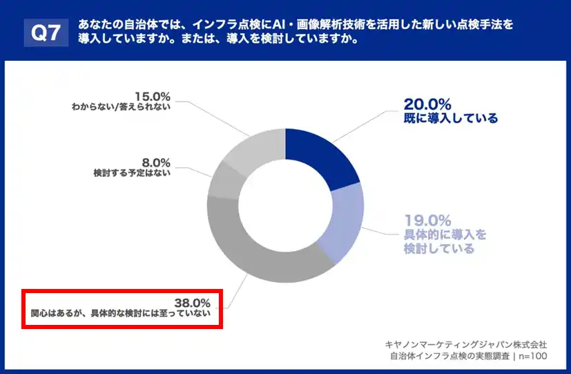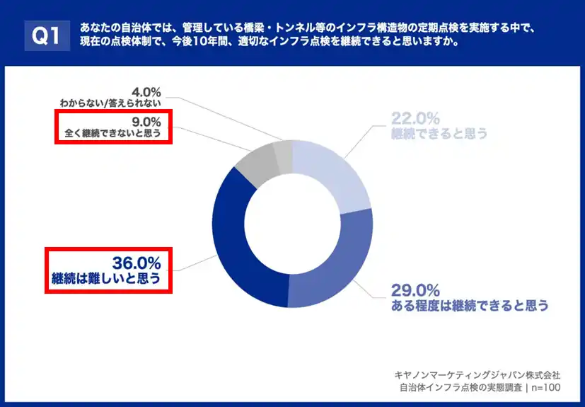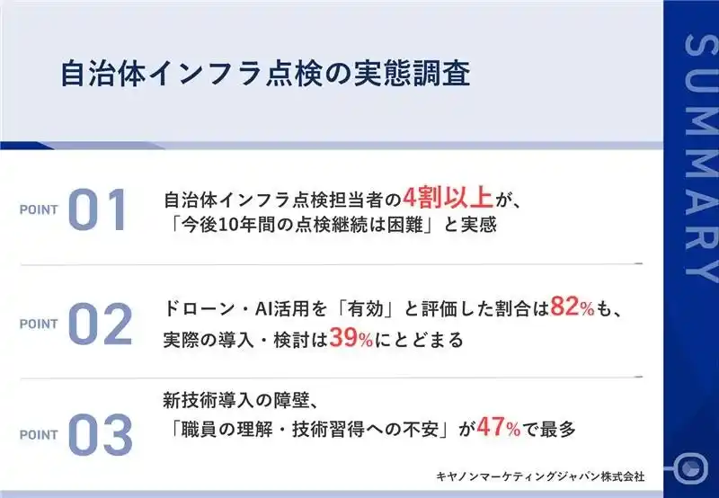 キヤノンマーケティングジャパン株式会社(代表取締役社長:足立正親、以下キヤノンMJ)は、インフラ点検業務に携わる自治体職員を対象とした調査結果を発表します。労働人口減少が進む「8掛け社会※1」を背景に、インフラ老朽化が進む一方、技術者不足で点検継続が困難となっています。国土交通省「インフラ長寿命化計画※2」により、デジタル技術を活用した点検の効率化と予防保全への転換が求められていますが、本調査では点検継続が困難との回答が4割を超える一方、新技術導入の課題が明らかになりました。キヤノンMJでは、調査結果に加え、東京都大田区のデジタル技術の活用事例を紹介するセミナーを2026年4月22日に開催し、解決策の普及に取り組んでまいります。 |
