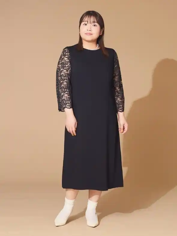 | 袖をフラワー柄のレース地で切り替えたきれいめワンピース。透け感のある袖は、品よく見せつつ軽やかさもプラスしてくれます。ストンと落ちるIラインシルエットが美しく、身体を締め付けずにゆったり着用できるのも嬉しいポイントです。 | |||