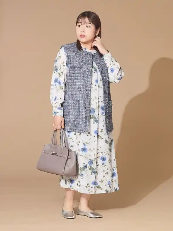| フェミニンなムードの花柄ワンピースは、ツィードジレを重ねて洗練された着こなしに。存在感のあるアイテム同士でも、トーンを揃えればすっきりまとまります。腰周りをカバーし、自然に縦長シルエットを作れるのもポイント。 | |||