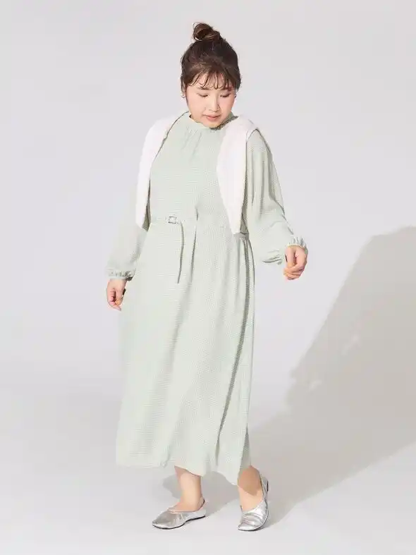 | メッシュ風の幾何学柄が表情豊かなプリントワンピース。ニュアンスのあるライトグリーンは、顔周りを明るく見せ季節感も高めてくれます。アクセサリーやシューズでツヤを足せば、スタイリングを引き締めてメリハリのある印象に。 | |||