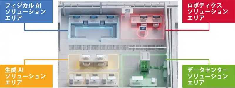 | 会場内の展示エリアでは、「フィジカルAIソリューション」「ロボティクスソリューション」「生成AIソリューション」「データセンターソリューション」の4つのテーマブースを設置し、NVIDIAをはじめとしたパートナー各社と連携したデモ展示を行います。 | ||||||||||||||||||||||||||||||