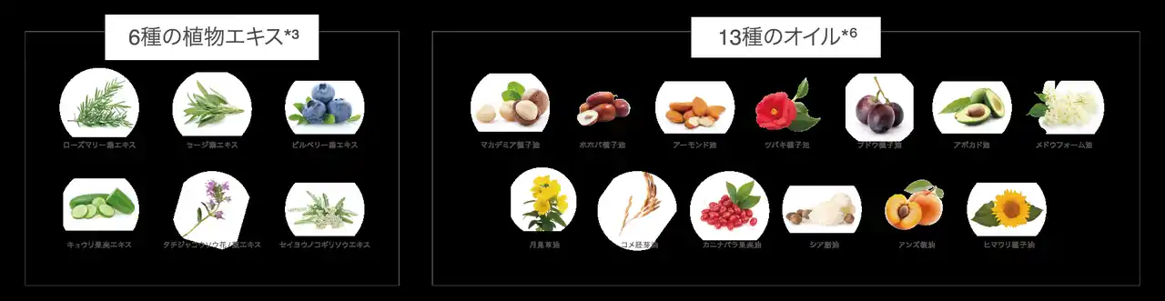 ローズマリー、セージ、ビルベリーなどの6種の植物エキス*³と、ホホバオイル、米ぬか、シアバターなど13種*⁶のオイルを厳選配合。 |
