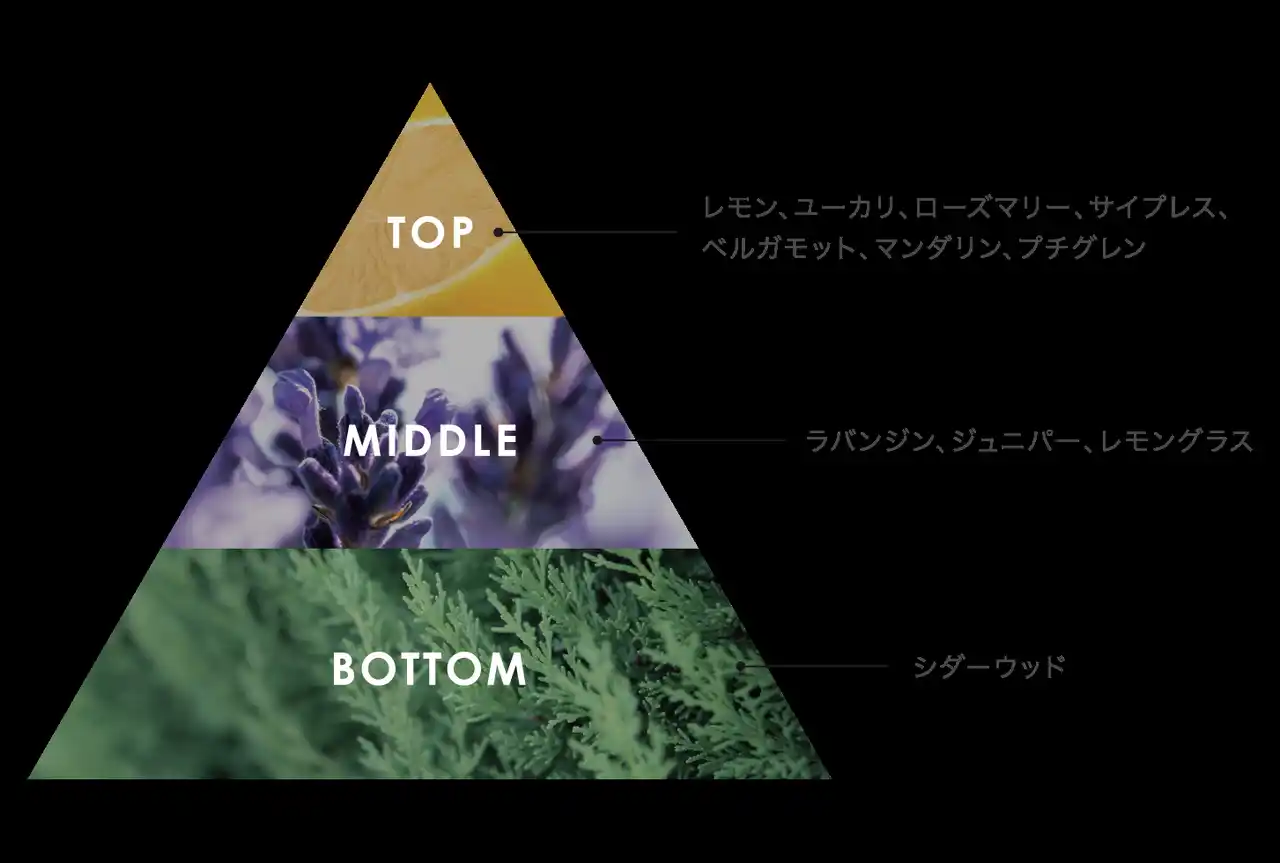 レモン、ユーカリ、ローズマリー、ベルガモット、カモミールなど13種の精油をブレンドした |