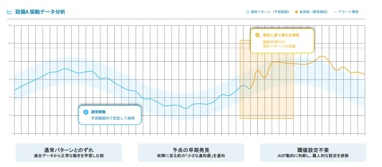 これまで多くの現場では、設備や環境の異常を検知する監視システムが導入されてきました。しかし、従来の仕組みは、あらかじめ設定したしきい値を超えた際にアラートが発報される「事後対応型」が中心でした。 |