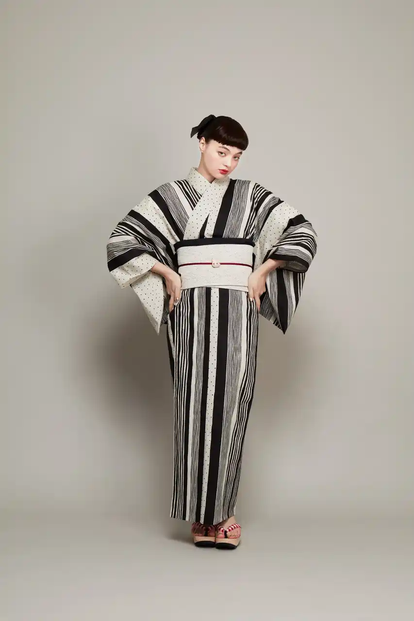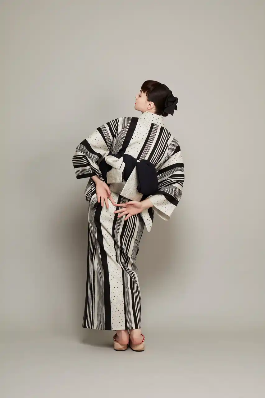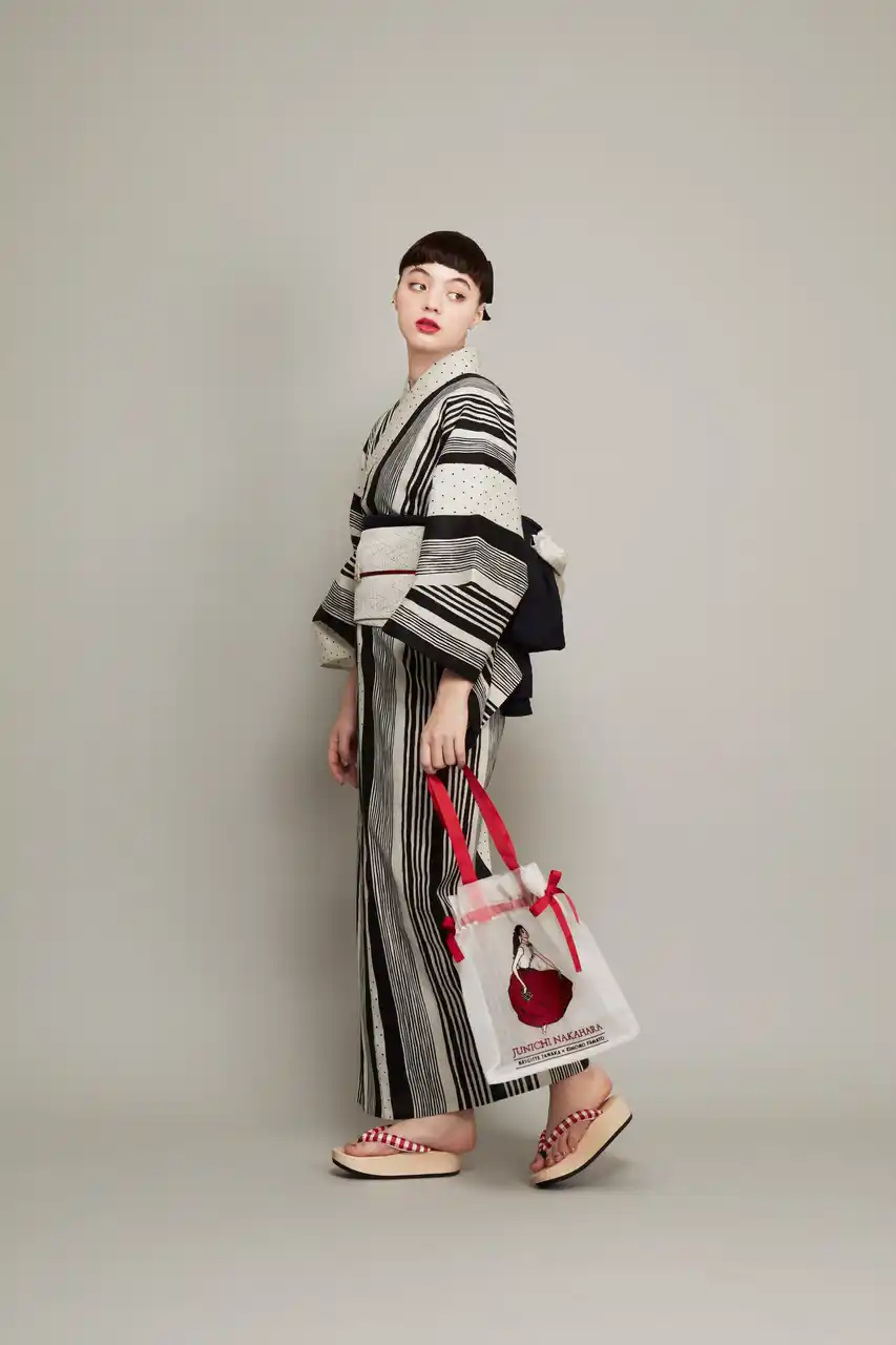中原淳一が描いた雑誌の挿絵をもとに、ドットとストライプを掛け合わせたデザイン。ビジュアルでは、衣紋を詰め、ウエストを際立たせた原画の着こなしをもとにした対丈スタイルを再現しています。 |