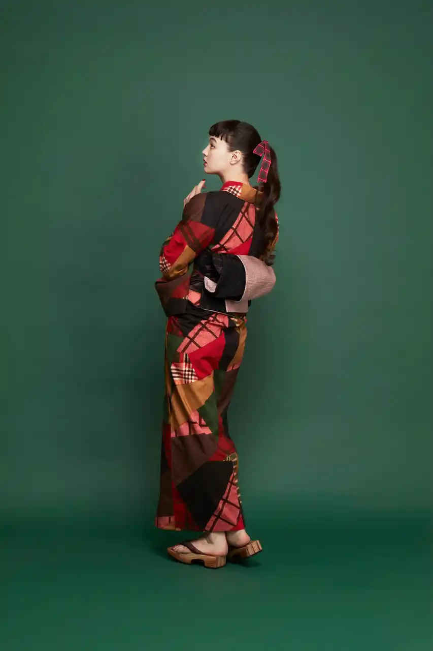 戦後の厳しい暮らしの中で、生活を楽しくするアイデアとして中原淳一が提案していた「パッチワークのきもの」をもとにデザインしたゆかた。インクジェット染色により、その風合いを繊細に再現しました。深みのある色合いで、初秋まで長くお楽しみいただけます。 |
