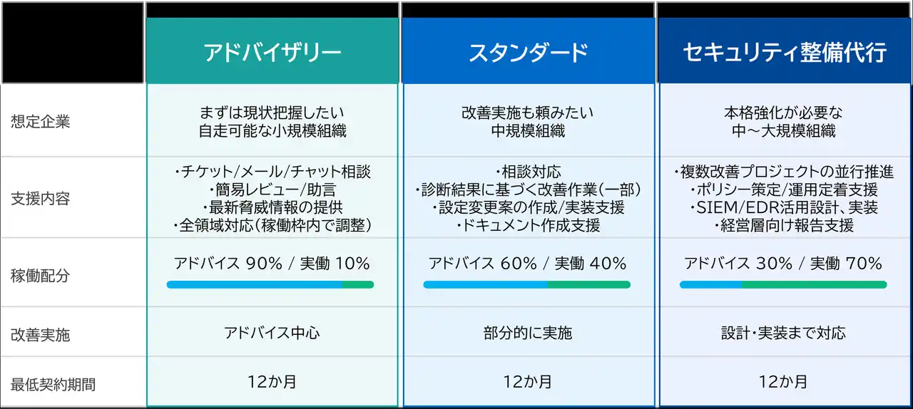 ・初回無償診断で攻撃を受けやすい弱点を可視化し、改善に向けたロードマップを提示 ・セキュリティの課題に合わせて導入できる「アドバイザリー」、「スタンダード」、「セキュリティ整備代行」の3つの定額プラン ・サプライチェーンセキュリティ評価制度に関するスポットコンサルティングも提供 |