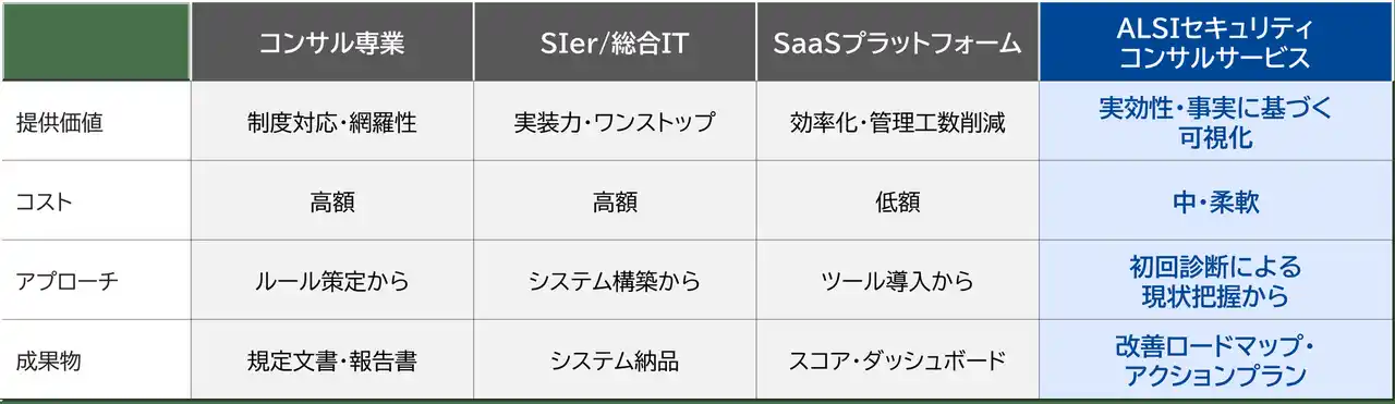 アルプス システム インテグレーション株式会社(本社:東京都大田区、代表取締役社長:金子 央、以下ALSI〔アルシー〕)は、セキュリティの課題に合わせて、現状把握から改善、セキュリティ製品・サービス導入後の運用支援までを提供する「ALSIセキュリティコンサルサービス」を2026年4月27日から提供開始いたします。 |