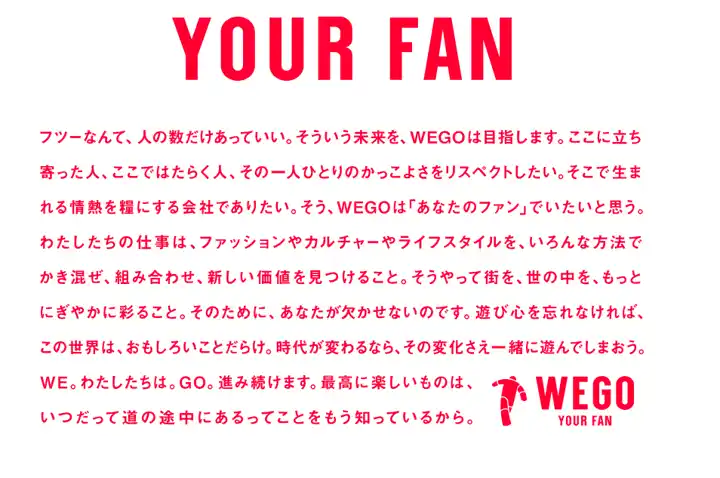 コーポレートスローガンに『YOUR FAN(あなたのファンになる)』をかかげ、ファッション、カルチャー、ライフスタイルと多岐にわたった商品開発や店頭イベントなど、そのストリートカルチャーや様々な界隈へのキュレーション力、プロジェクト支援など、若者から絶大な支持を得ている。 |