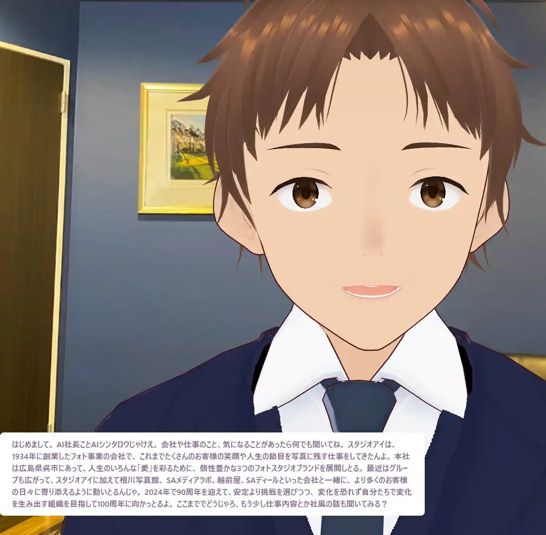 【株式会社エスエーホールディングス】 【採用DX】広島弁で語る「AI社長」が、学生の本音にズバリ回答!株式会社スタジオアイは《生成AIを活用したインタラクティブな会社説明会》を実施。今後は学生のニーズを先回り出来るよう進化予定。