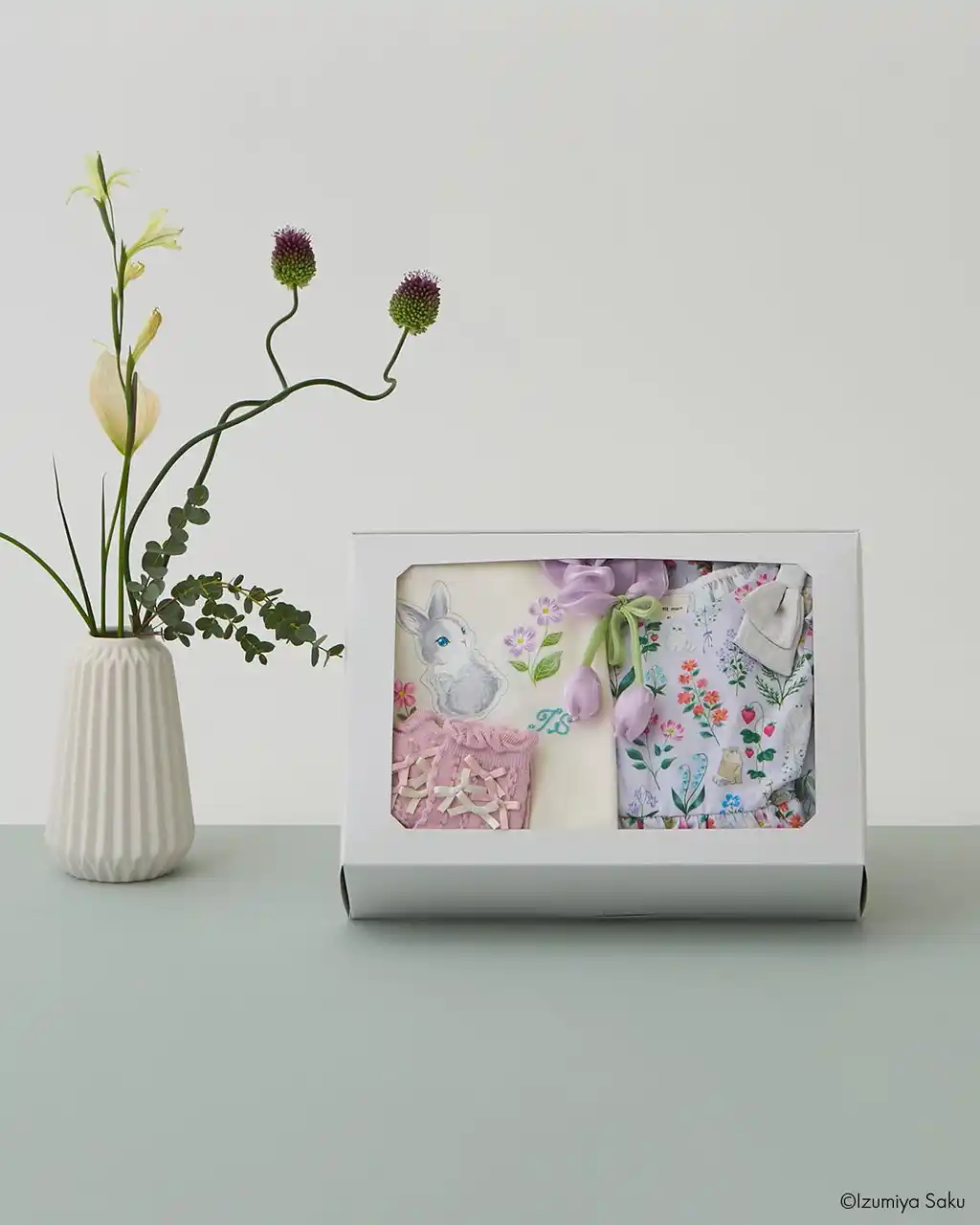 Petit mainらしいデイリーに着やすいデザインと、泉屋サクさんが描く可愛らしいイラストが融合した特別感のあるアイテムは、出産祝いなどの贈り物としても喜ばれること間違いありません。 |