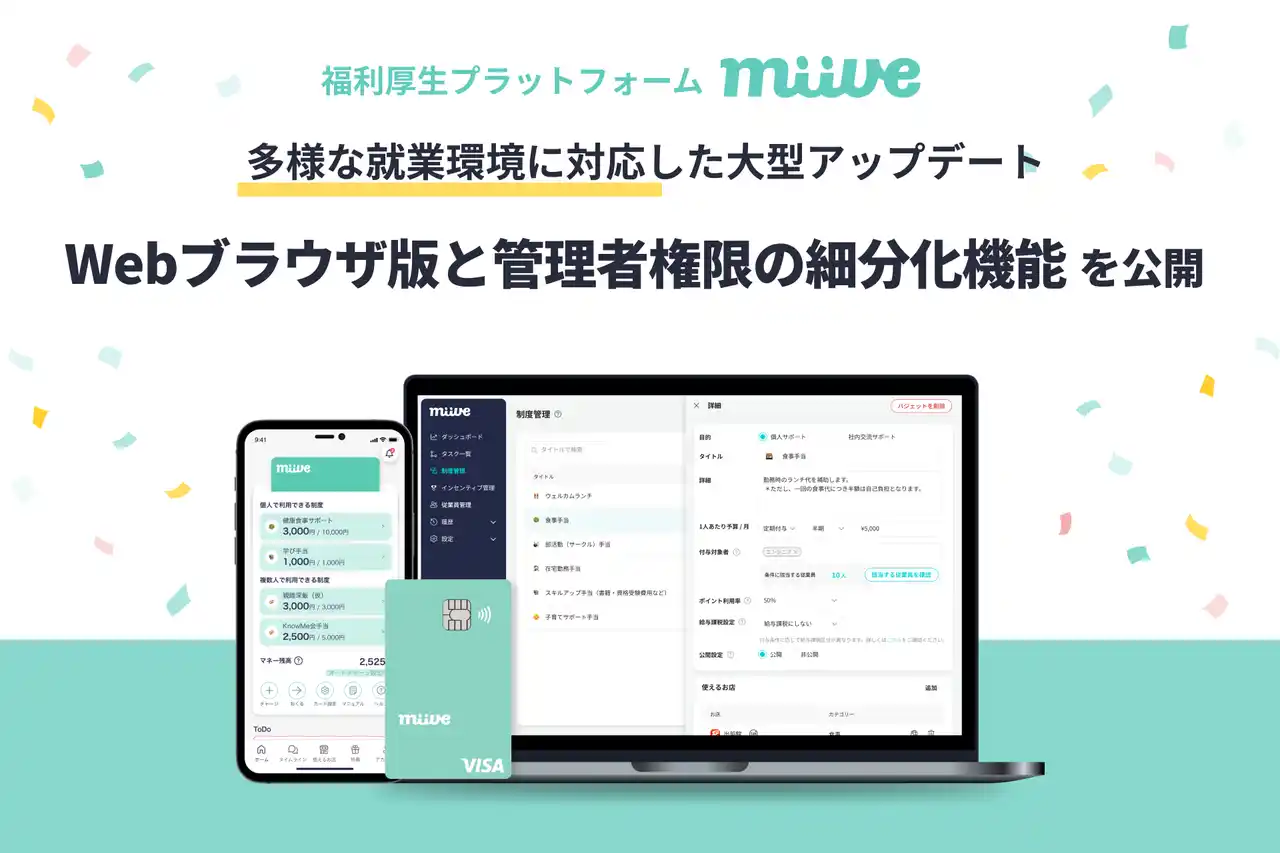 | 株式会社miive(本社:東京都渋谷区、代表取締役CEO:栗田 廉)が提供する福利厚生プラットフォーム「miive(ミーブ)」はこのたび、幅広い就業環境および従業員の皆様にご利用いただける大型アップデートをリリースしました。本アップデートでは、Webブラウザ版と管理者権限の細分化機能により、多様な働き方に対応した使いやすい環境を実現しています。 | |||