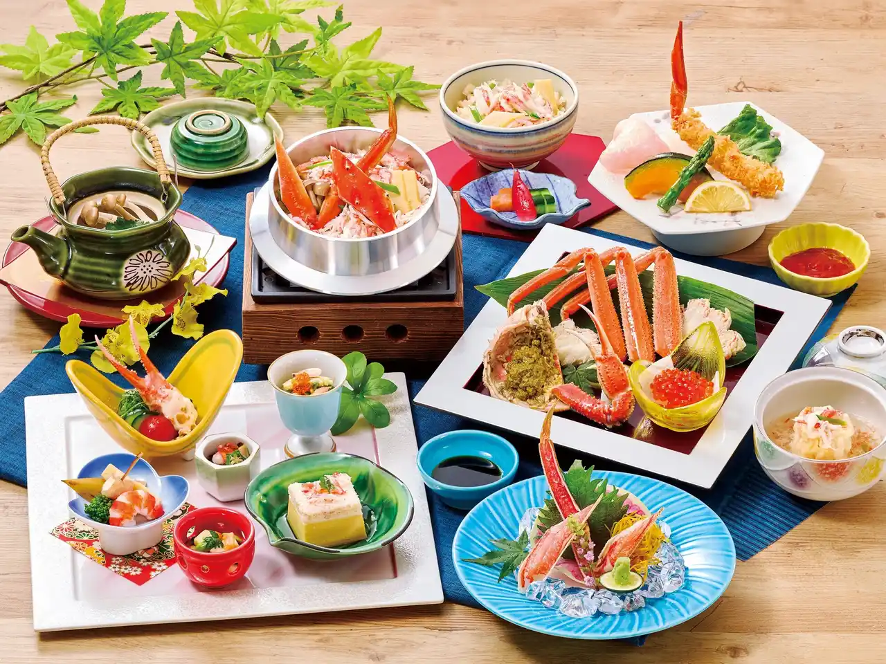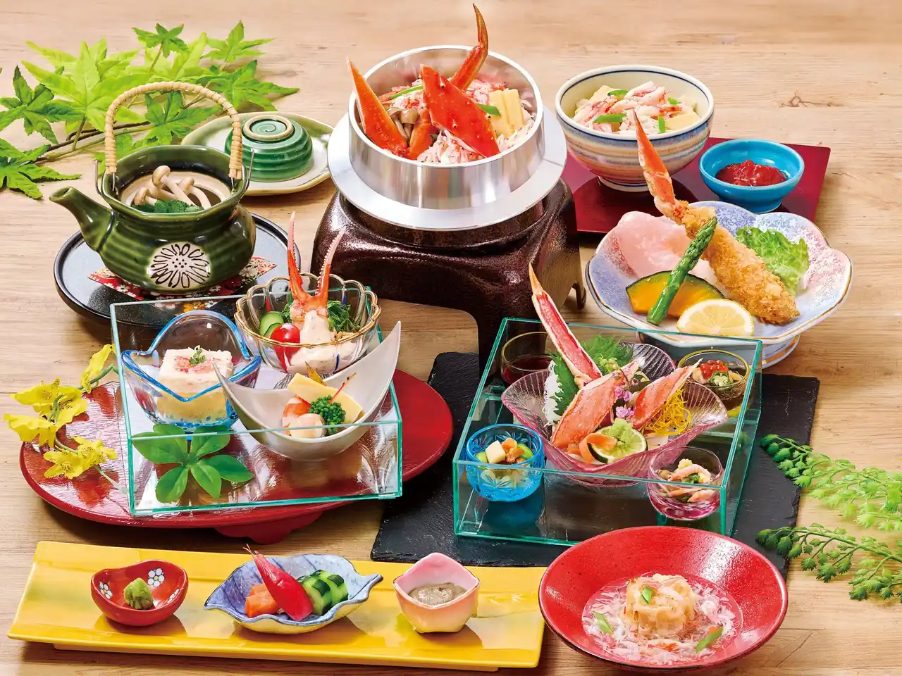 たらばとずわい釜めし、茹でがに半身盛り、彩り前菜プレート、かに刺身、かに餡かけシューマイ、かにフライ、香の物 ※特製出汁付き |
